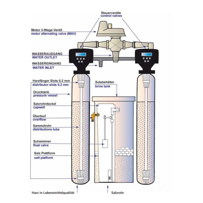 Korrosionsbeständige Behälter aus GFK, gefüllt mit Enthärterharz mit Trinkwasser und Lebensmittelzulassung nach Europe Resolution AP (97) 1 und US FDA 21 CFR 173.25, Solebehälter aus PE, Absaugeinrichtung und Verbindungsleitung zum Steuerkopf. |